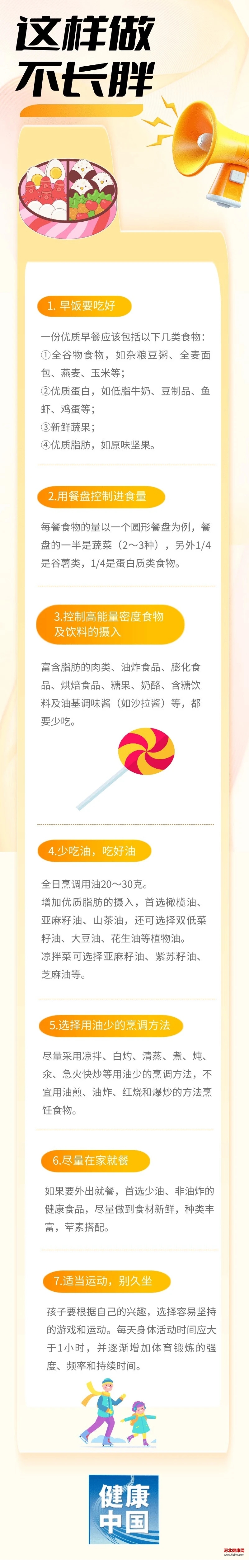 寒假不长胖的秘密在这里|寒假健康提示 2024-01-30 15:36:28 来源:河北健康网 编辑:墨公子 寒假期间,孩子们容易饮食不规律,吃零食及喝含糖饮料的机会增多,加上天气寒冷,主动运动的意愿降低,体重很容易上涨。体质量指数(BMI)在正常范围内的孩子,怎么做能够快乐过寒假且不长胖呢?这份“秘诀”请收好。 (稿件来源:健康中国)