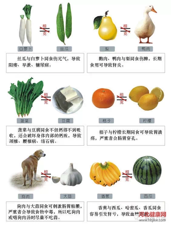 许多人都非常关注“饮食宜忌”,在我们日常的饮食当中,食物之间也有“相生相克”的说法,即两种或两种以上的食物,如果搭配合理,会“相生”,起到营养互补、相辅相成的作用。如搭配不当,极容易导致生病或中毒。